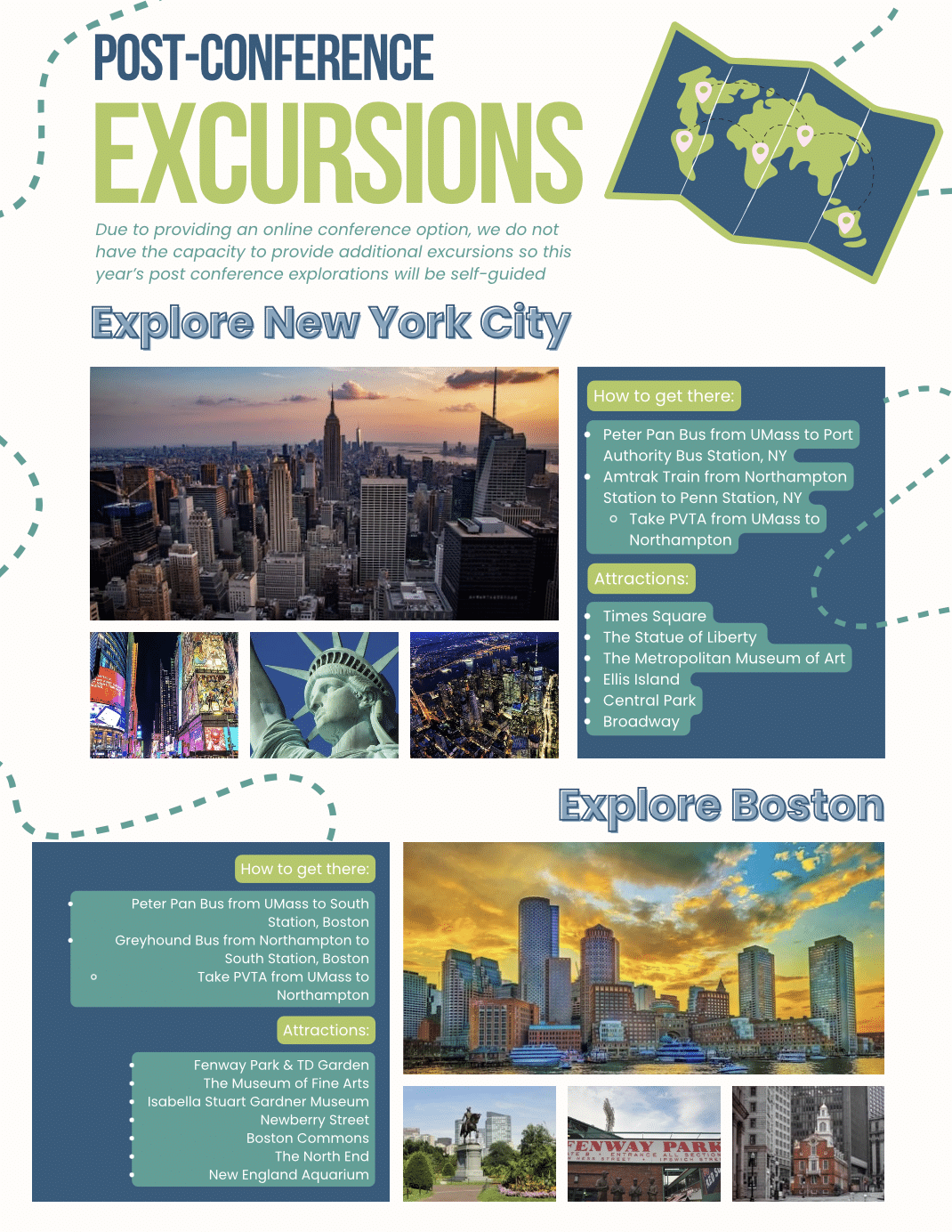 But self-organized post-conference excursions to New York City and Boston are absolutely possible! See below for information on how to get to these cities from UMass Amherst.